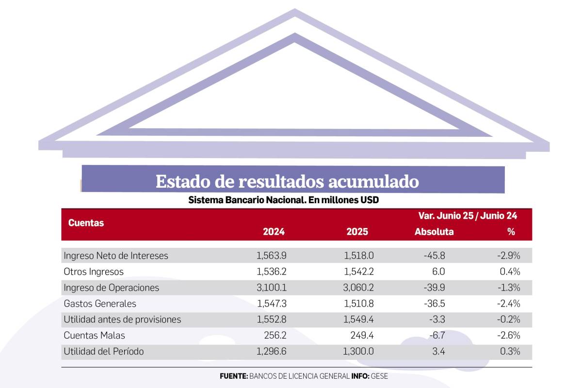 Los costos operativos del SBP aumentaron 6,9 %, hasta $2.540,1 millones, debido principalmente al alza en intereses pagados y comisiones por captaciones. Como resultado, el ingreso neto por intereses se redujo 2,9 %, situándose en $1.518,1 millones. Los ingresos no financieros se mantuvieron estables en $1.542,2 millones (0,4 %). Se observaron incrementos en comisiones (10,2 %), operaciones con divisas (44,4 %) y dividendos (9,6 %), aunque fueron contrarrestados por una caída de 18,9 % en otros ingresos.