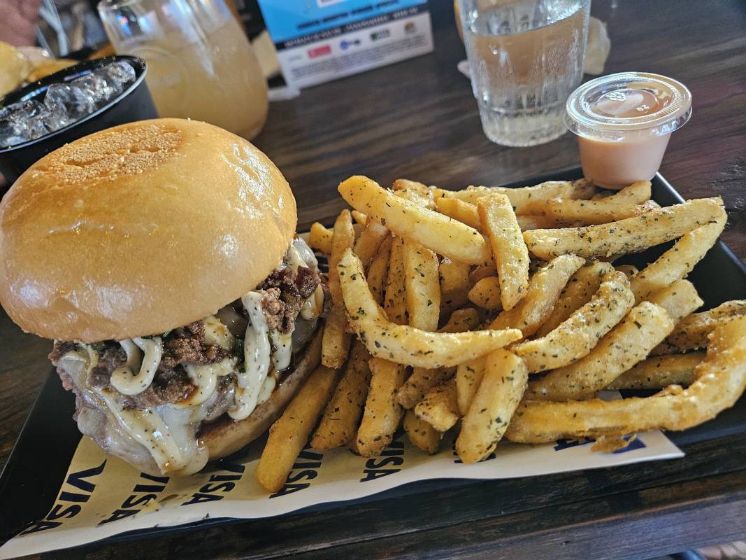 pan artesanal de amapola, pastrami colonense hecho en casa, con aproximadamente 200 horas de trabajo entre curado ahumado y demás; queso gouda derretido, pimento cheese estilo Lowcountry, doble smash de carne de res local y salsa muhammara (pimientos y nueces y especias Gullah Geechee). Chips de plátano para aportar crocancia, Las papasse sirven con kétchup de zapallo. Una propuesta que sostiene la razón de ser del restaurante y que mantiene el sabor de cada una de sus capas.