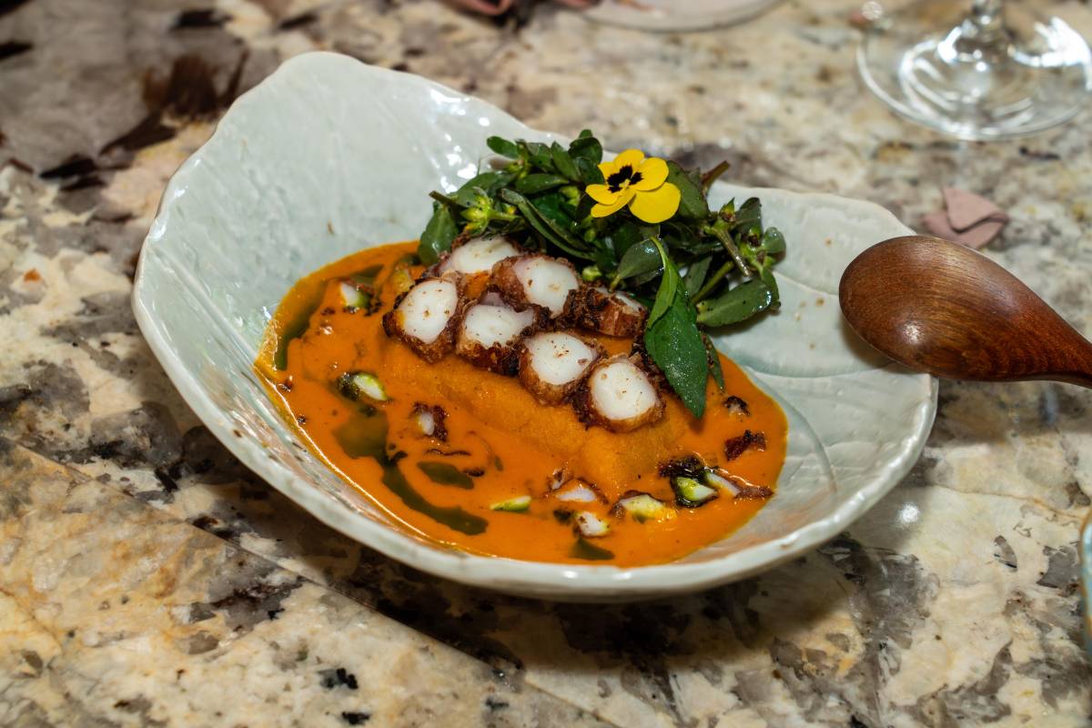 Llegan a la mesa un guacho de cordero con una salsa rondón a base de un caldo de pescado, plátano y especias (Boca del Toro) y un toque de ají chombo. El sabor del cordero es delicado y se amalgama bien con la salsa y el picantito; un tortelli de pato, con masa hecha en casa a base de espinacas y culantro, rellenos de pato confitado acompañados de una demi -glace de café geisha. Por último, último un tamal de pulpo. La masa de maíz está coloreada con achiote. Sobre el tamal, pulpo frito crujiente, caldo rojo de pulpo y una ensalada de menta y verdolaga.