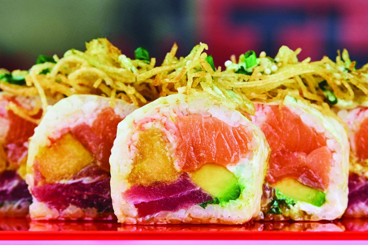 Llegó a la mesa una Pizza Nación de salmón. “Es como comer sushi, tiene una base crocante de arroz de sushi, la freímos, la napamos con queso crema y tenemos diferentes toppings, como furikake de salmón, salsa de naranja y miel, masago y wakame que van a dar un toque muy especial. La idea es que es otra forma de comer el sushi, más creativa y mucho más divertida”, asegura el chef. Nos lleva a la memoria el concolón de casa, pero mejorado con el umami que aportan los toppings.