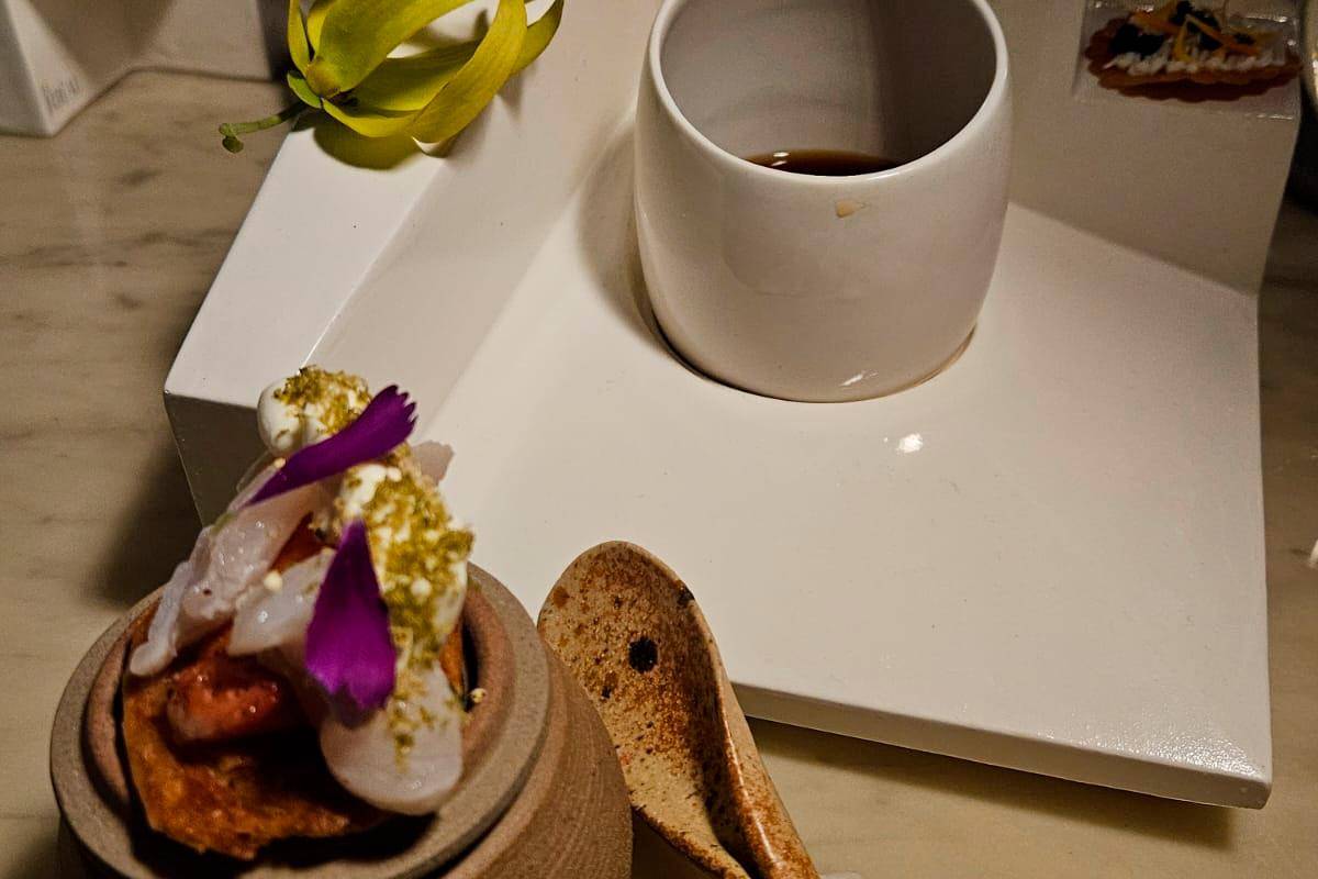 Para detallar los bocados que acompañan el ritual, el chef Lorenzo se acercó a la mesa. “Cada uno, dependiendo de su propia nariz, puede sentir algo diferente en el café. Yo sentí flores blancas como el sauco y mucha acidez, lo asocié con la maracuyá, naranja y perlas de bálsámico, entonces la idea de empezar con el bite de Debora y seguir con los demás”, detalló.